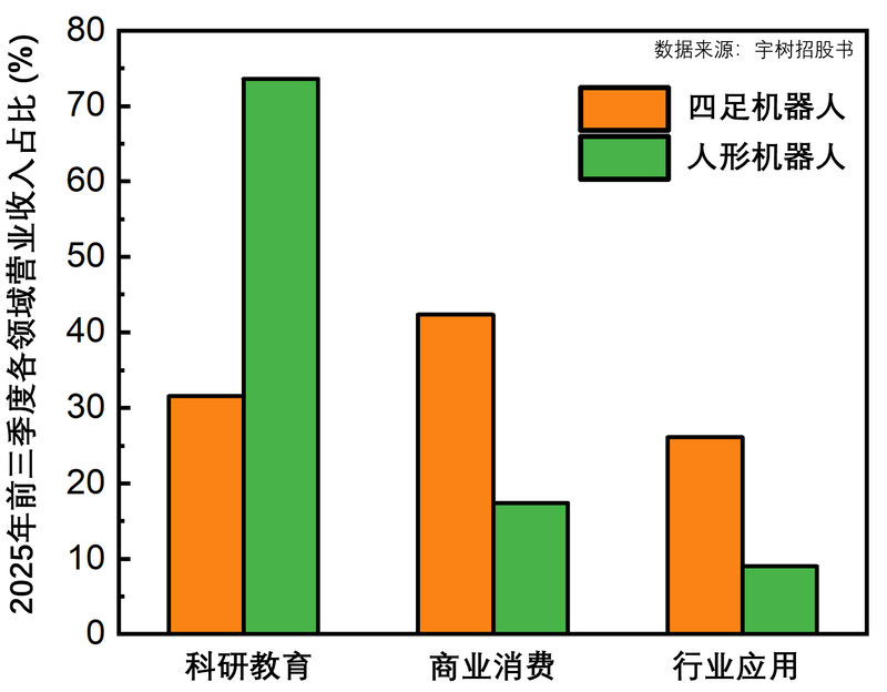 不过,上海证券交易所官网同步披露的宇树关于问询函的回复显示,科研教育仍然是宇树人形机器人的主要应用场景。2025年前三季度,来自科研教育领域的收入占宇树人形机器人总收入的73.6%,商业消费占17.39%,行业应用仅占9.01%,主要用于企业导览、智能制造、智能巡检等。